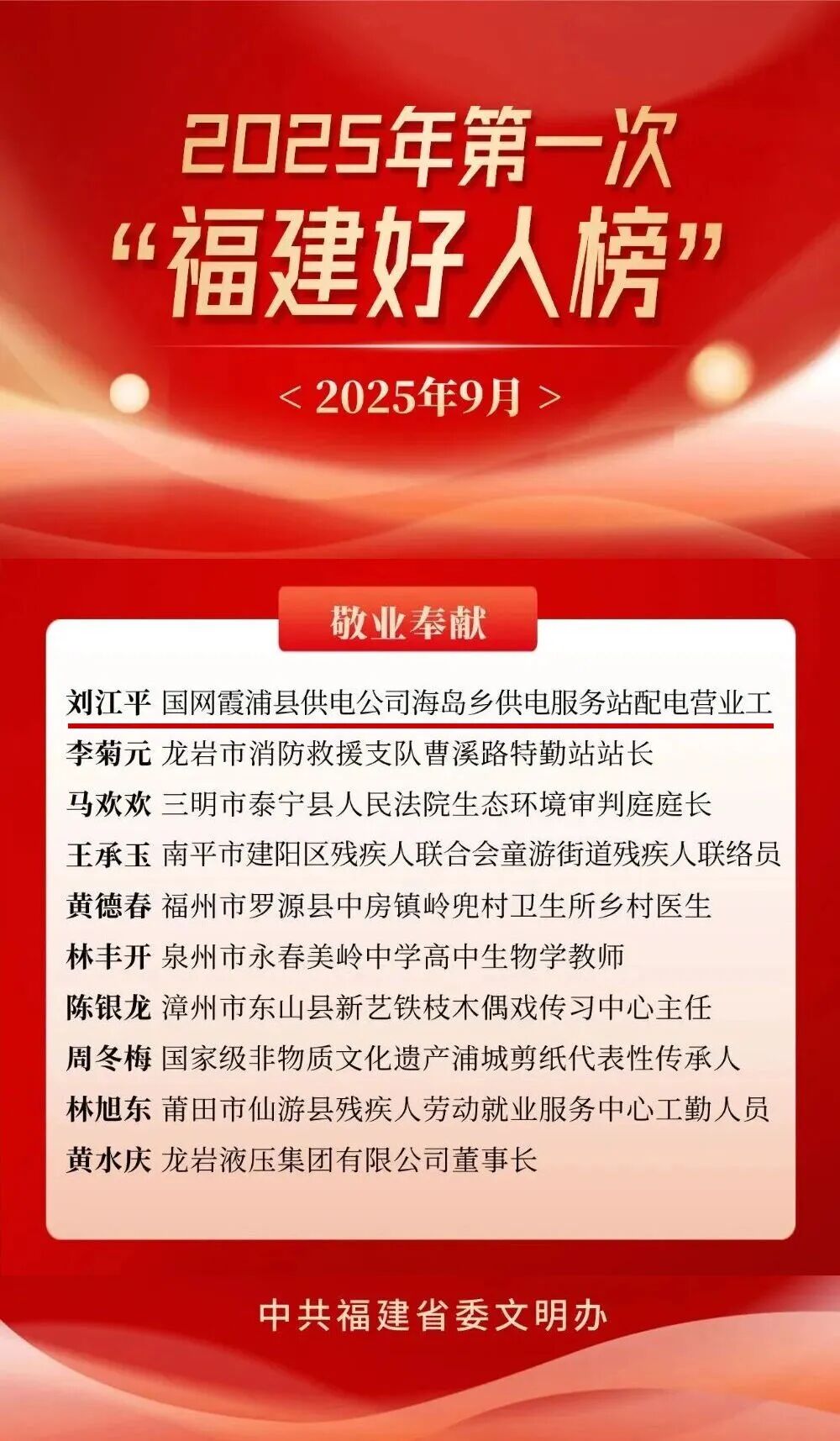 近日,福建省委文明辦發(fā)布2025年第一次“福建好人榜”,國網(wǎng)寧德供電公司員工劉江平獲評“福建好人”。