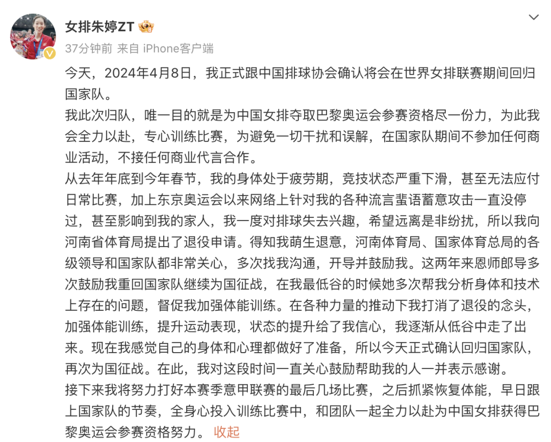 4月8日晚,中國女排球星朱婷通過自己微博公開表態(tài),自己正式跟中國排球協(xié)會確認(rèn),將會在世界女排聯(lián)賽期間回歸國家隊,并為中國女排今年打進(jìn)巴黎奧運(yùn)會做出貢獻(xiàn)。具體內(nèi)容如下: