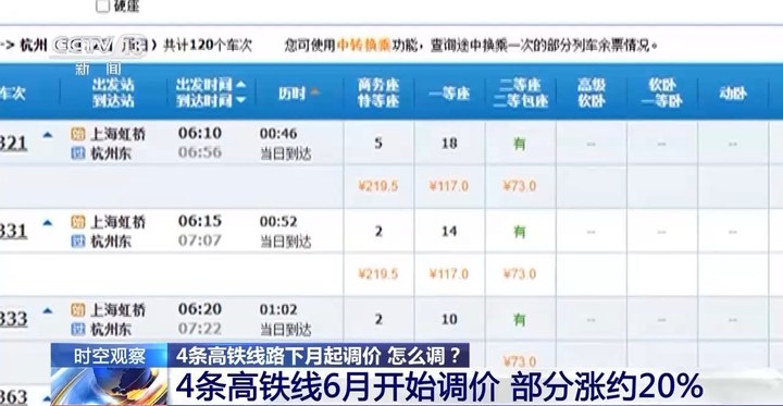 再如滬昆高鐵滬杭段方面,上海虹橋至杭州東二等座公布票價(jià)提升至87元,較現(xiàn)行的公布票價(jià)73元上漲19.18%。