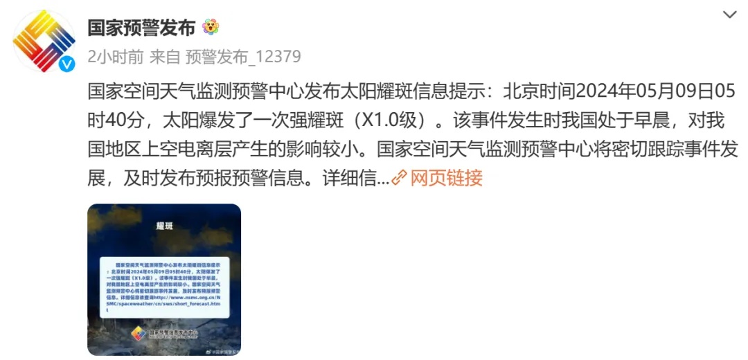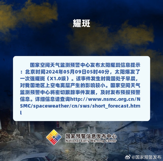 國家空間天氣監(jiān)測預(yù)警中心發(fā)布太陽耀斑信息提示:北京時(shí)間2024年05月09日05時(shí)40分,太陽爆發(fā)了一次強(qiáng)耀斑(X1.0級(jí))。該事件發(fā)生時(shí)我國處于早晨,對(duì)我國地區(qū)上空電離層產(chǎn)生的影響較小。國家空間天氣監(jiān)測預(yù)警中心將密切跟蹤事件發(fā)展,及時(shí)發(fā)布預(yù)報(bào)預(yù)警信息。