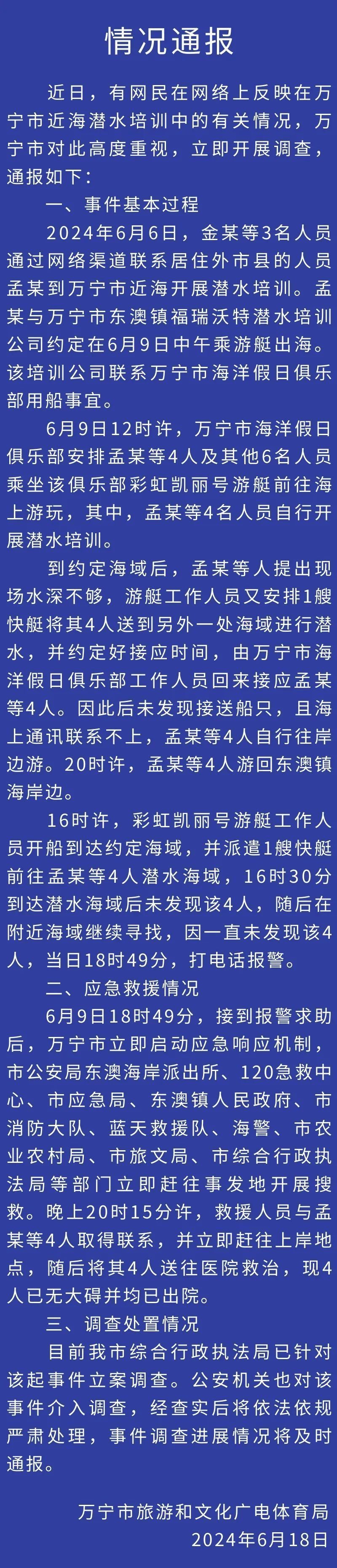 6月18日,針對“游客反映潛水時被棄海中”一事,海南萬寧市旅游和文化廣電體育局發(fā)布情況通報: