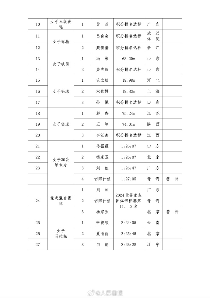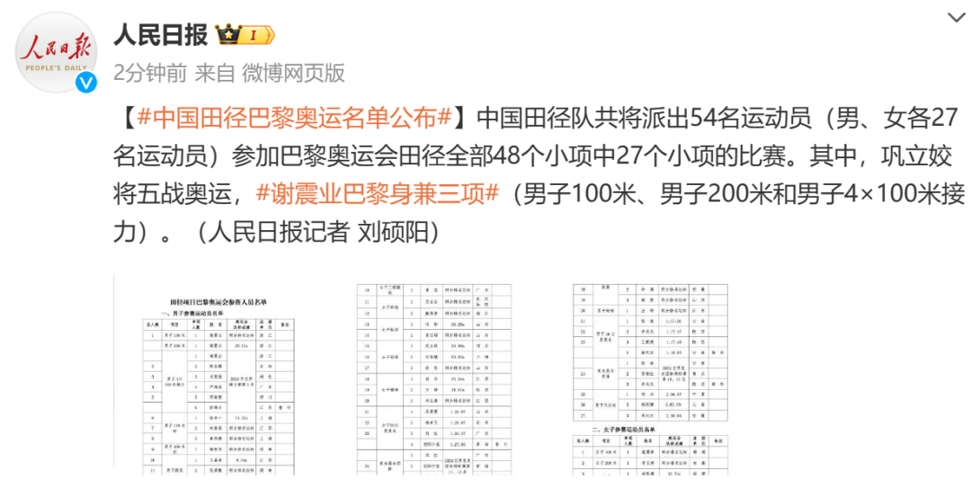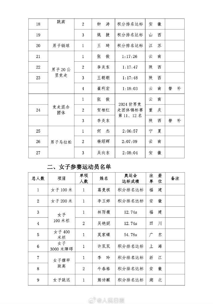 中國(guó)田徑巴黎奧運(yùn)名單公布