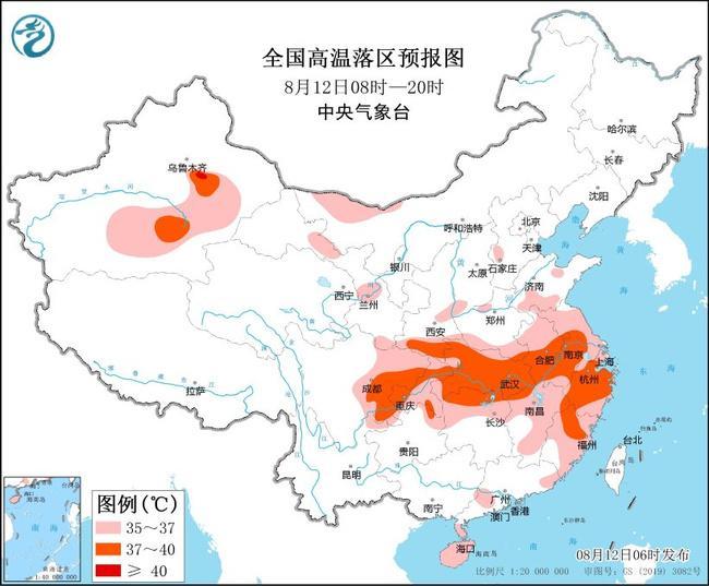 預(yù)計8月12日白天,新疆吐魯番盆地和南疆盆地東部、內(nèi)蒙古西部、甘肅中西部、陜西南部、四川盆地、重慶以及黃淮南部、江淮、江漢、江南北部和中東部等地有35℃以上的高溫天氣,其中,吐魯番盆地和南疆盆地東部、陜西南部、重慶、四川盆地東部、安徽中南部、江蘇西南部、湖北、湖南北部、江西北部、浙江、福建北部等地的部分地區(qū)最高氣溫仍有37℃以上,局地可達(dá)40℃左右。