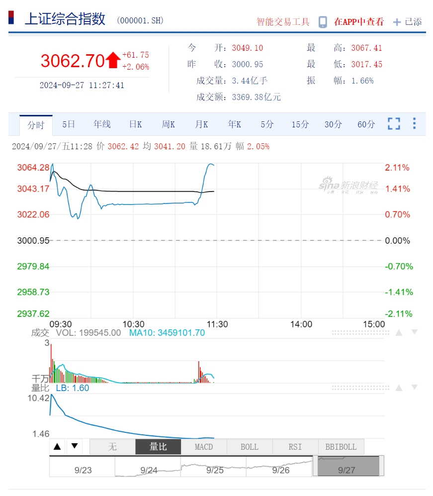 9月27日上午,滬指漲幅擴大至2%。上交所交易陸續(xù)恢復正常。