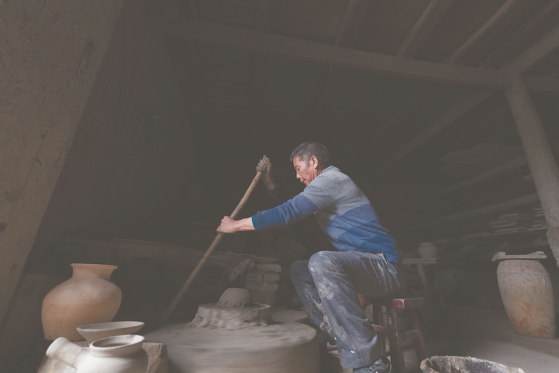 肖家漲轉動笨重的陶車。作為萌源制硋世家第七代傳人,50多年來,他一直堅守家族傳承的制硋技藝。