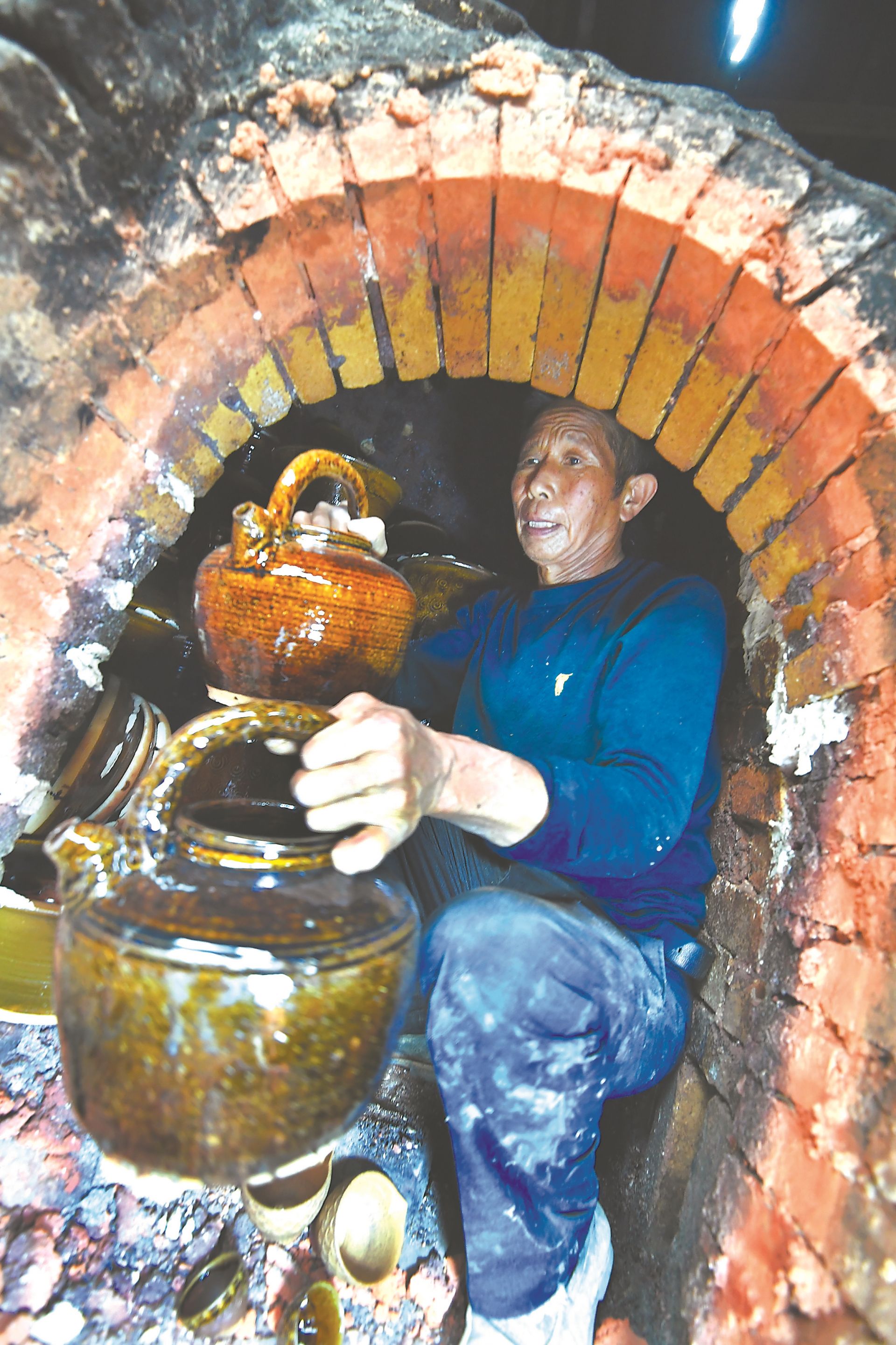 開窯了,肖家漲小心翼翼地把硋器從窯洞拿出。