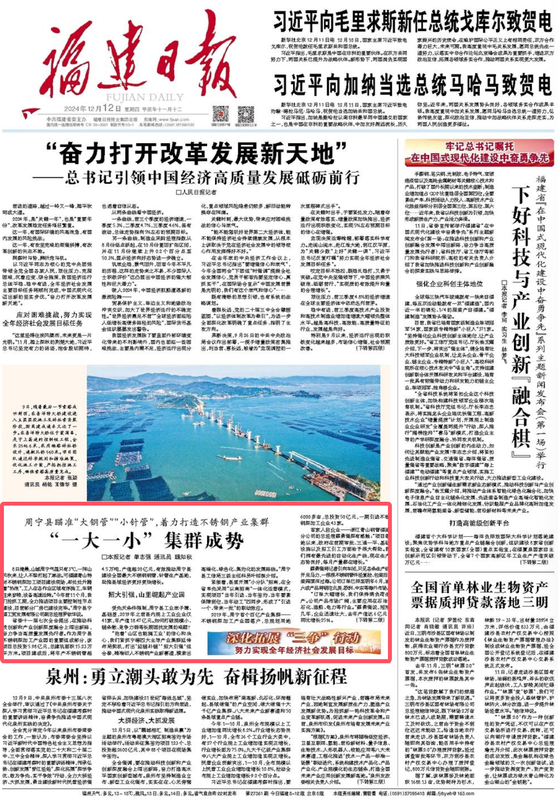 周寧縣瞄準(zhǔn)“大鋼管”“小針管”,著力打造不銹鋼產(chǎn)業(yè)集群。12月12日,《福建日?qǐng)?bào)》頭版刊發(fā)《“一大一小” 集群成勢(shì),福建山里崛起產(chǎn)業(yè)園》文章,現(xiàn)予以轉(zhuǎn)載。