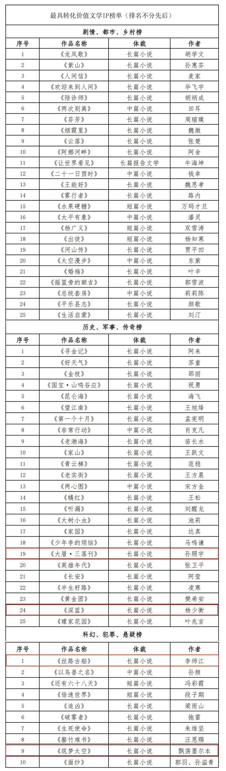 據(jù)悉,最具轉(zhuǎn)化價(jià)值文學(xué)IP推薦榜由中國(guó)作協(xié)社聯(lián)部、創(chuàng)研部從千余部作品中進(jìn)行篩選,經(jīng)過專家評(píng)審,最終遴選出最具影視改編潛力的60部?jī)?yōu)秀作品,其中既包括中國(guó)作協(xié)“新時(shí)代山鄉(xiāng)巨變創(chuàng)作計(jì)劃”“新時(shí)代文學(xué)攀登計(jì)劃”入選作品、茅盾文學(xué)獎(jiǎng)申報(bào)作品、魯迅文學(xué)獎(jiǎng)申報(bào)作品和全國(guó)著作權(quán)保護(hù)與開發(fā)平臺(tái)登記作品,也包括人民文學(xué)雜志社、中國(guó)作家雜志社、小說選刊雜志社、作家出版社的推薦作品。