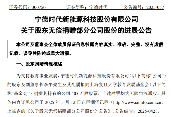 7月10日,寧德時(shí)代發(fā)布公告稱,公司副董事長李平及其配偶廖梅向上海復(fù)旦大學(xué)教育發(fā)展基金會(以下簡稱基金會)捐贈的其持有的公司405萬股股票,已經(jīng)完成過戶手續(xù)。按照寧德時(shí)代最新股價(jià)計(jì)算,這筆無償捐贈的價(jià)值預(yù)估約11億元。