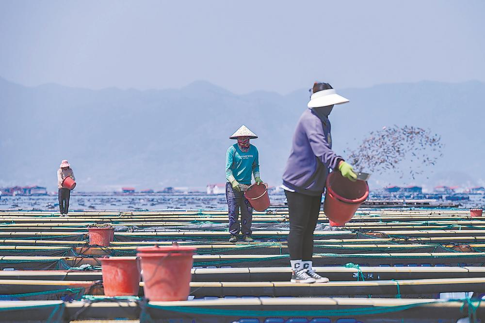 3月20日,頂著海上沒有遮擋的陽光,大舅哥吉爾伍且(中)和妻子曲比馬麻(后)及小舅子吉爾伍加的妻子日伍牛(前)在漁排上投放飼料。