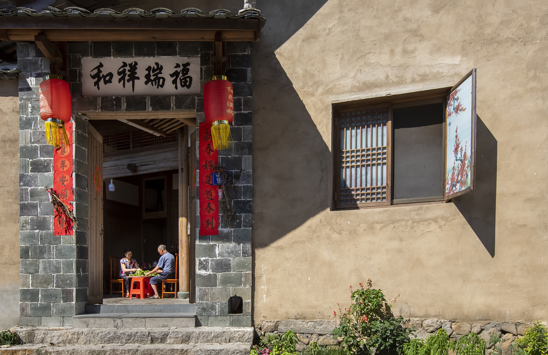 這種視讀書為重的風氣,傳承至今,是樓下村處處可見的耕讀文化的一大特點。不然,你看,“保合太和”大宅門的院門主面上,還有唐岑參的《春半與群公同游元處士別業(yè)》,全詩摘了大半:“郭南處士宅,門外羅群峰。勝概忽相引,春華今正濃。山廚竹里爨,野碓藤間舂。對酒云數(shù)片,卷簾花萬重。巖泉嗟到晚,州縣欲歸慵。”
