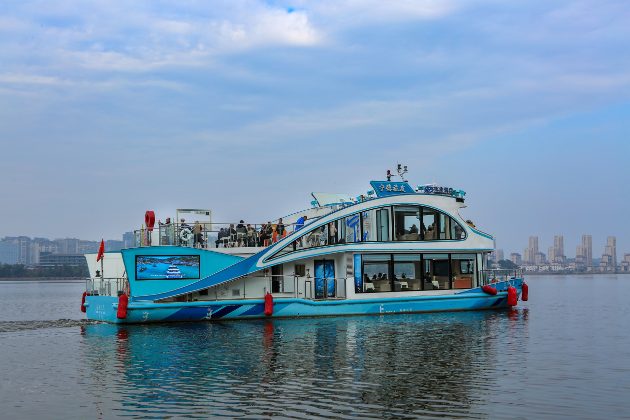 告別了歷史的回響,午后明亮的光線將采風(fēng)團的目光引向了網(wǎng)紅打卡點——“東湖之星”電動觀光游船。一行人登上“東湖之星”,整個視角便豁然開朗。船行“湖心”,仿佛一顆流動的寶石,在碧波萬頃的東湖上劃開一道漣漪。放眼望去,湖光山色交相輝映,城市的繁華與自然的靜謐在此刻完美交融。作家們憑欄遠(yuǎn)眺,任憑湖風(fēng)拂面,心中涌動的詩情早已按捺不?。粩z影家們則迎來了絕佳的創(chuàng)作時機,他們用廣角鏡頭收納天地之大美,用長焦鏡頭捕捉飛鳥掠過水面的靈動瞬間,將一幅“城在水中,水在城中”的壯麗生態(tài)畫卷,盡收“鏡”底。