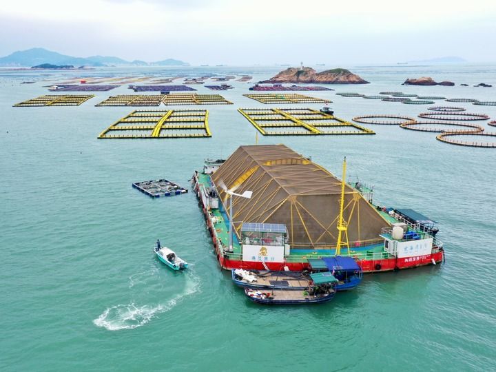 這是2023年10月10日拍攝的福建省連江縣定海灣內(nèi)的“定海灣1號”深遠海養(yǎng)殖平臺(無人機照片)。新華社記者 姜克紅 攝