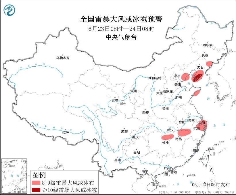 預(yù)計(jì)6月23日08時至24日08時,吉林東南部、遼寧東北部和南部、河北東北部、山東東部、安徽南部、上海、湖南東北部、江西北部、浙江北部等地的部分地區(qū)將有8級以上雷暴大風(fēng)或冰雹天氣,其中,遼寧南部的局地將有10級以上雷暴大風(fēng),最大風(fēng)力可達(dá)11級以上;吉林東部、遼寧東部和南部、河北東北部、安徽中南部、江蘇南部、上海、湖北東部和南部、湖南、江西中北部、浙江中北部、四川南部、貴州、云南東北部和南部、廣西南部和東北部、廣東中西部、海南島等地的部分地區(qū)將有小時雨量大于20毫米的短時強(qiáng)降水天氣,其中,安徽南部、湖北東南部、湖南北部、江西北部、浙江中部、貴州西部和東北部、云南東北部等地的局地小時雨量大于50毫米,最大可達(dá)80毫米以上。