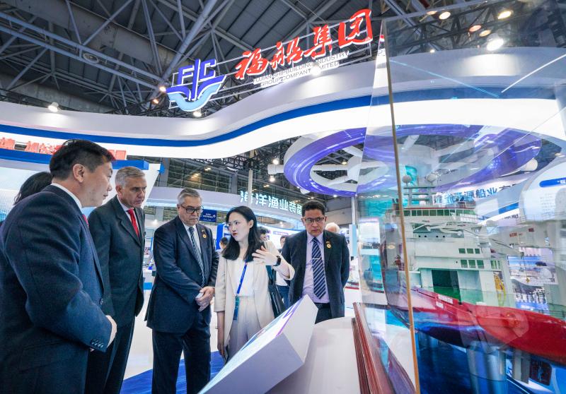 2023中國海洋裝備博覽會上,外國嘉賓在福船集團(tuán)展位了解“105米飽和潛水支援船”的技術(shù)特點(diǎn)。王毅 攝