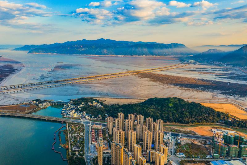 從寧德市區(qū)東望三都澳海域,公路、鐵路大橋猶如長虹橫跨。楊婀娜 攝