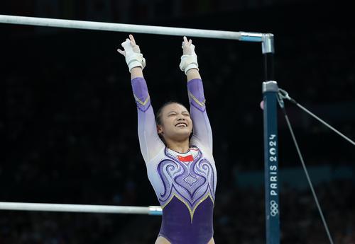 當(dāng)日,在貝爾西體育館舉行的巴黎奧運(yùn)會(huì)體操高低杠決賽中,中國選手邱祺緣獲得亞軍。新華社記者 曹燦 攝