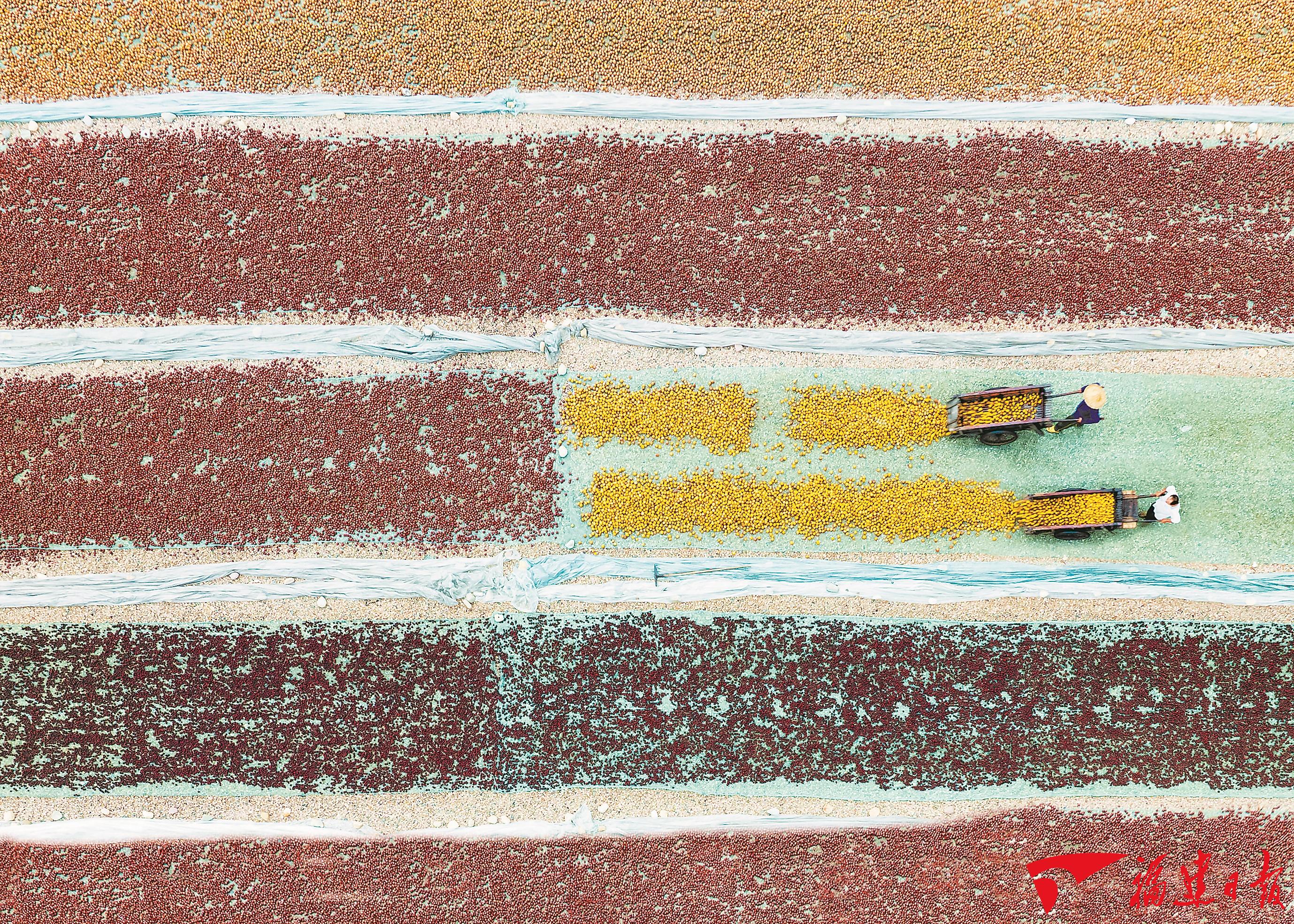近日,在福安市潭頭鎮(zhèn)大莊村的曬果場(chǎng),果農(nóng)搶抓晴好天氣,晾曬芙蓉李。潭頭鎮(zhèn)素有“芙蓉李之鄉(xiāng)”美譽(yù),今年李果豐產(chǎn),全鎮(zhèn)2.98萬(wàn)畝芙蓉李約產(chǎn)鮮果2.46萬(wàn)噸。其中,制成李干400多噸,產(chǎn)值近千萬(wàn)元。