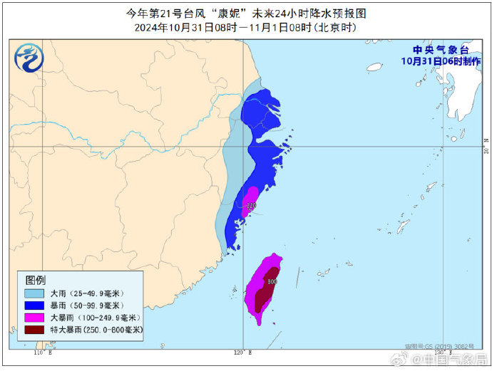 降水預(yù)報(bào):10月31日08時(shí)至11月1日08時(shí),福建東北部、浙江中東部、上海、江蘇南部等地有暴雨,其中,福建東北部、浙江東部等地的部分地區(qū)有大暴雨(100—220毫米);臺(tái)灣島有大暴雨,臺(tái)灣島東部的部分地區(qū)有特大暴雨(250—800毫米)。