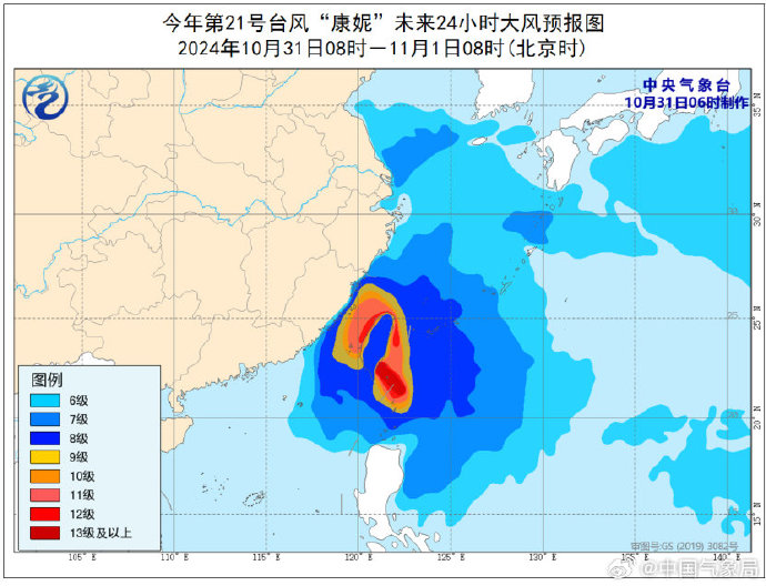 大風(fēng)預(yù)報(bào):10月31日08時(shí)至11月1日08時(shí),受冷空氣和“康妮”的共同影響,東海大部及釣魚島附近海域、臺(tái)灣海峽、臺(tái)灣以東洋面、巴士海峽、南海北部及東沙群島附近海域、浙江沿海、福建沿海、臺(tái)灣島沿海將有7—9級(jí)大風(fēng),陣風(fēng)10—11級(jí);其中臺(tái)灣海峽、臺(tái)灣以東洋面和巴士海峽的部分海域、臺(tái)灣島東部沿海、福建中部沿海的風(fēng)力有10—12級(jí),陣風(fēng)13—14級(jí),臺(tái)風(fēng)中心經(jīng)過的附近海面風(fēng)力有13—16級(jí),陣風(fēng)17級(jí)及以上。