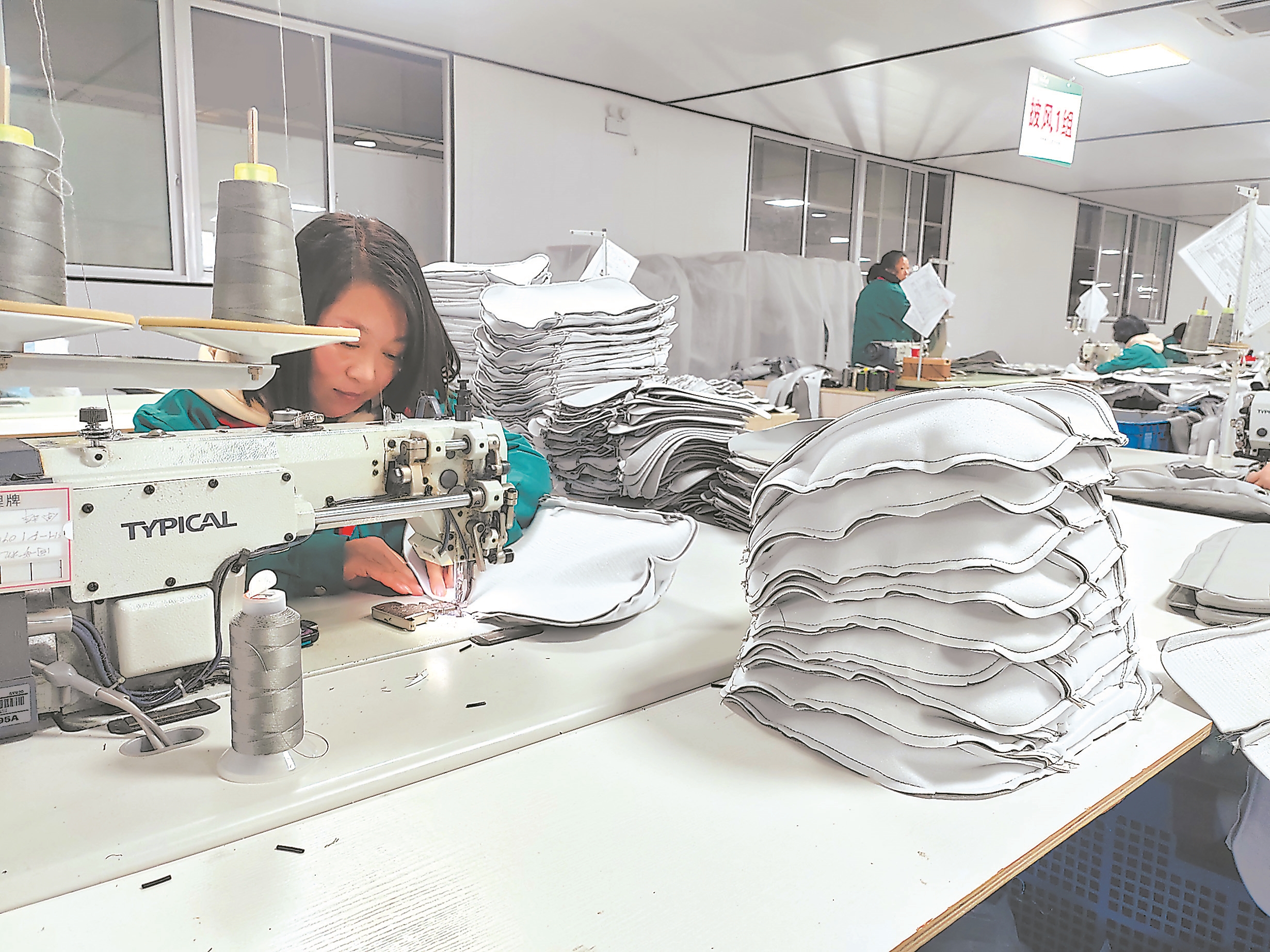 在博禾(福建)電子科技有限公司縫紉車間,工人在縫制按摩器皮套。