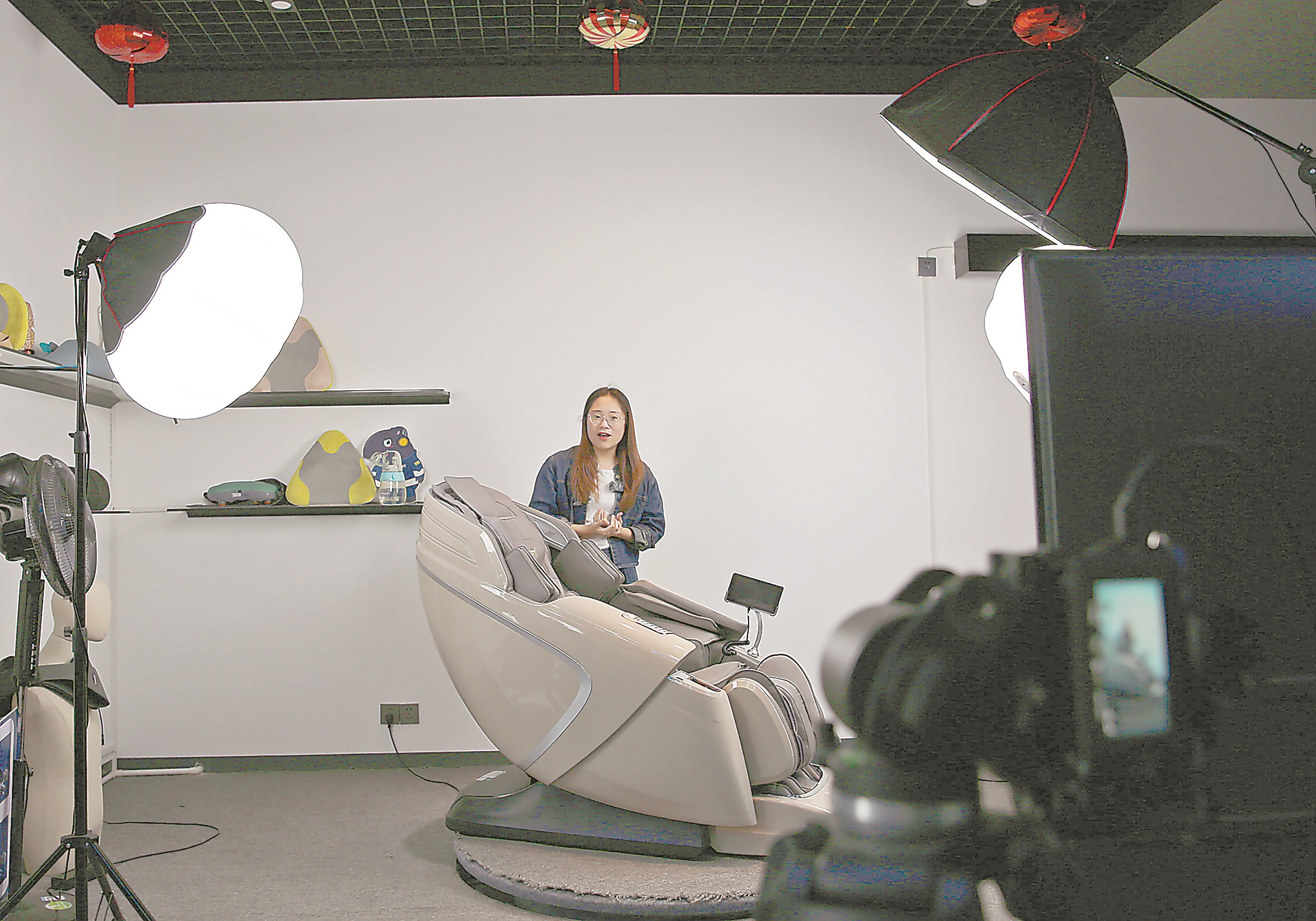 在福安市怡捷(福建)電子科技有限公司,主播通過網(wǎng)絡(luò)直播介紹新研發(fā)的按摩椅。 吳其文 攝