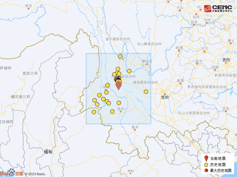 歷史地震:根據(jù)中國(guó)地震臺(tái)網(wǎng)速報(bào)目錄,震中周邊200公里內(nèi)近5年來發(fā)生3級(jí)以上地震共117次,最大地震是2021年5月21日在云南大理州漾濞縣發(fā)生的6.4級(jí)地震(距離本次震中51公里),按震級(jí)大小前50次歷史地震分布如圖。