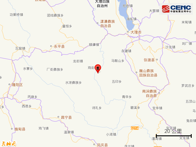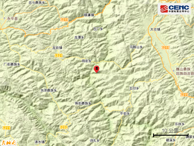 速報(bào)參數(shù):據(jù)中國(guó)地震臺(tái)網(wǎng)正式測(cè)定,4月19日5時(shí)54分在云南大理州巍山縣發(fā)生4.2級(jí)地震,震源深度10公里,震中位于北緯25.22度,東經(jīng)99.96度。