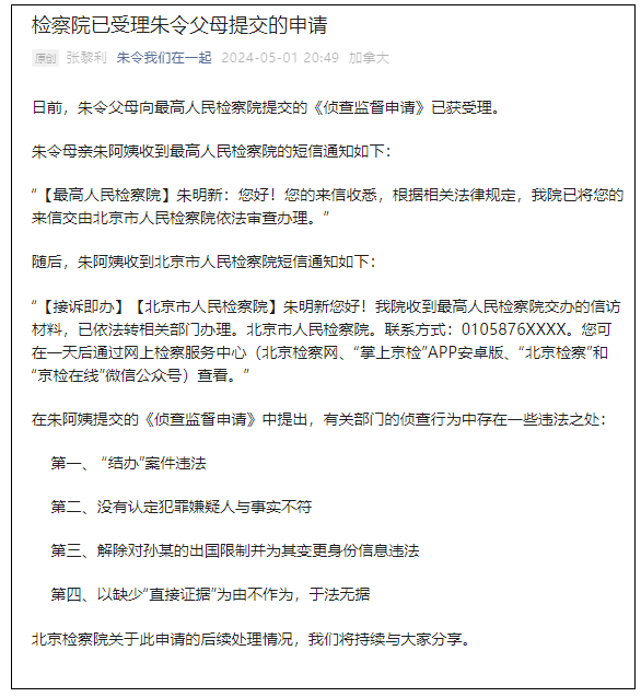 5月1日,微信公眾號(hào)“朱令我們?cè)谝黄?rdquo;透露“清華鉈中毒案”最新進(jìn)展稱,日前,朱令父母向最高人民檢察院提交的《偵查監(jiān)督申請(qǐng)》已獲受理。