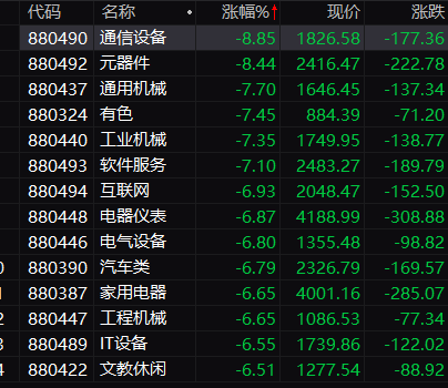 各大板塊全線下跌,通信設(shè)備、元器件、通用機(jī)械、有色等多個(gè)板塊開盤跌幅超過7%。